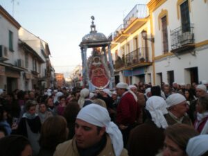 En el paso por el poblado de Setefilla, al llegar delante de la puerta de su Iglesia Parroquial, se descubrirá el velo anterior de las Andas y se detendrá la Procesión por el tiempo del canto de una Salve.