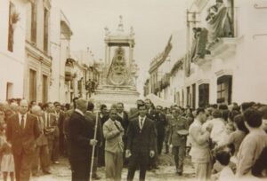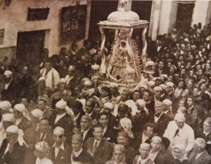 Como dijimos, cauce y expresión de la devoción loreña, era la Cofradía de Nuestra Señora, instituida a mediados del siglo XVI para acompañar a la Virgen su titular cuando se trasladaba y velar por su debido culto. En sus orígenes, estuvo formada por dos clases diferentes de miembros: los Hermanos Mayores y los Hermanos Menores o simples devotos. Los primeros, muy pocos, recibidos en la Cofradía con riguroso criterio, fueron individuos de un estrato social alto, nobles o hidalgos y personas de elevada condición, que gozaban de la prerrogativa de asistir a los Cabildos de la Cofradía, siempre celebrados en grado de Hermanos Mayores, y ocupar escaños preferentes en las fiestas litúrgicas de la Virgen, 25 de marzo y 8 de septiembre, a las que acudían en corporación, portando una vela encendida o hacha, sellada con una “María”, para distinguirse del Común. De entre los Hermanos Mayores se elegía periódicamente la Junta de Oficiales, compuesta por un Mayordomo, que regía la Cofradía y presidía sus Cabildos y actos de cultos, dos Alcaldes, un Escribano, dos Diputados de cuentas, y un Mayordomo de librete. Desde muy temprano, el fervor que se tenía a la Imagen trajo consigo que la Cofradía de Nuestra Señora acumulase una serie de bienes, resultado de donaciones: tierras, casas, objetos sagrados y fondos provenientes de limosnas y tributos, cuya administración corría a cargo del Mayordomo. Con estos recursos, la Cofradía pudo emprender algunas acciones, siendo las más importantes en este período las que correspondieron a las mayordomías de Alonso Ramírez de Montalbo (1686-1703) y Juan Rodrigo Quintanilla y Andrade (1708-1727), al haberse adquirido en el primer mandato las bellísimas andas de plata que hoy posee la Virgen, realizadas por el platero sevillano Diego Gallegos, y reconstruirse totalmente el Santuario durante el segundo.